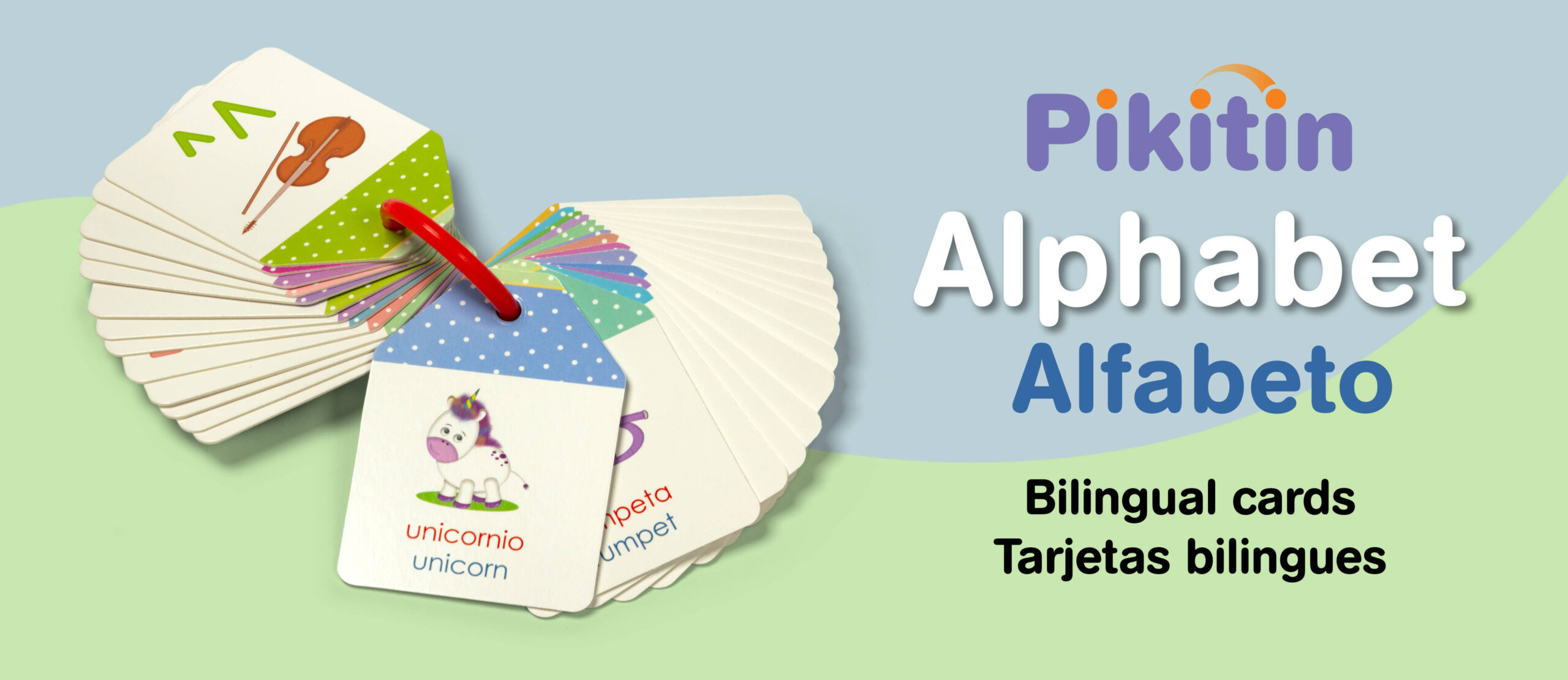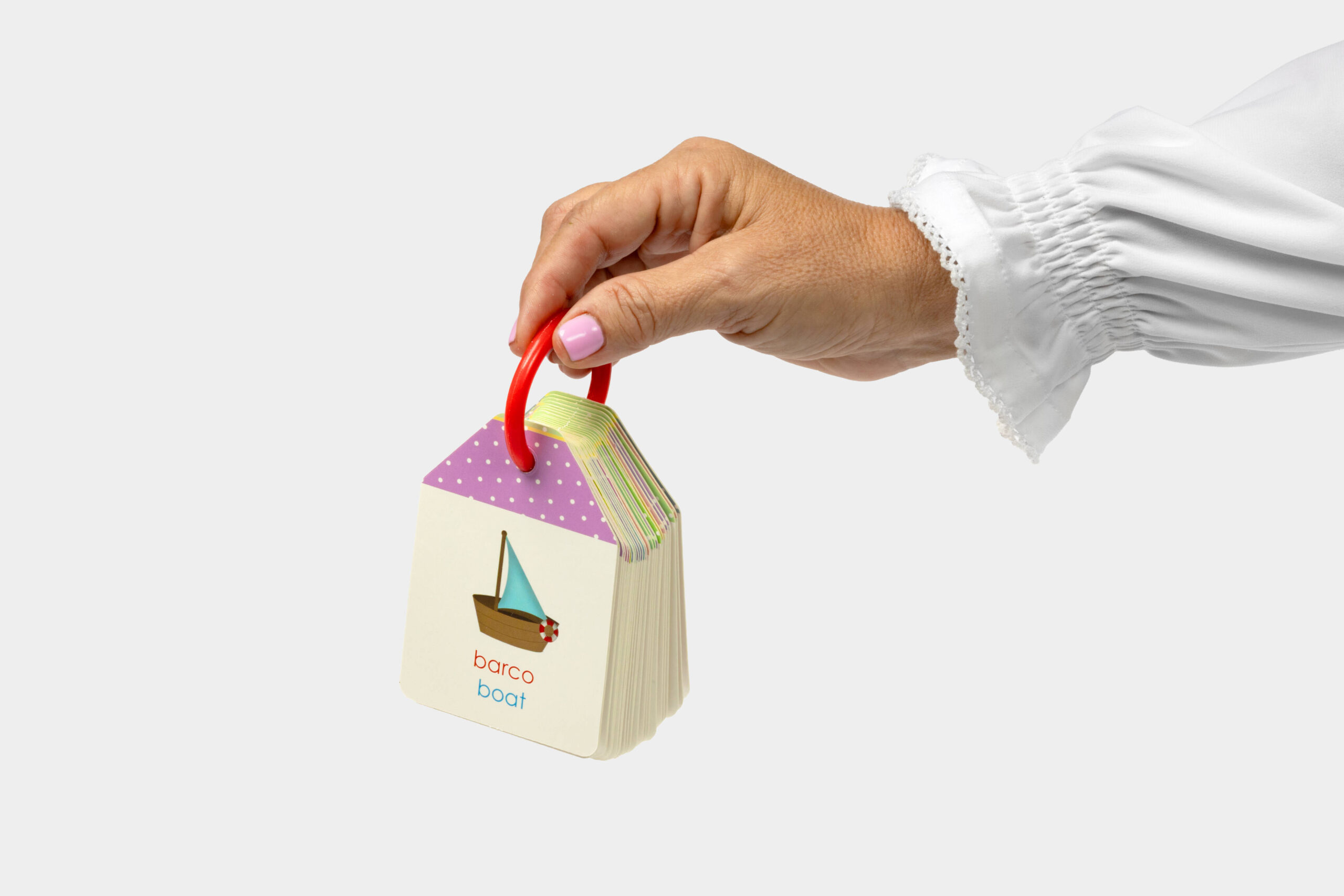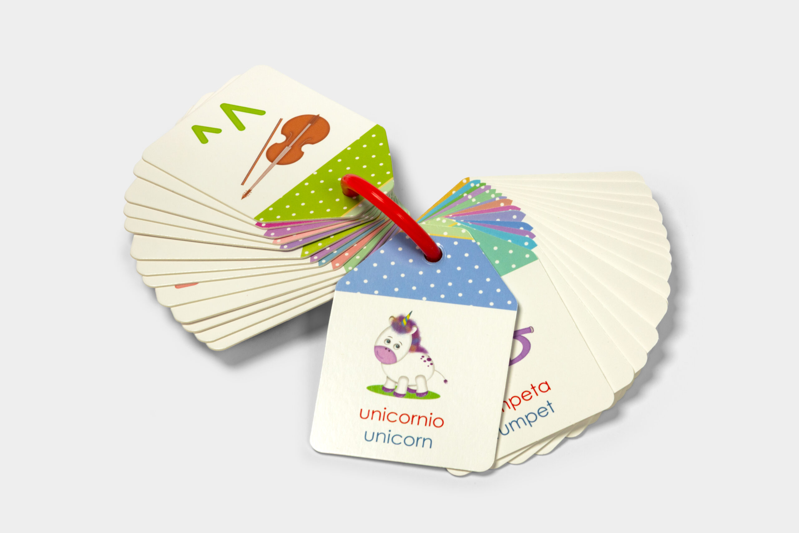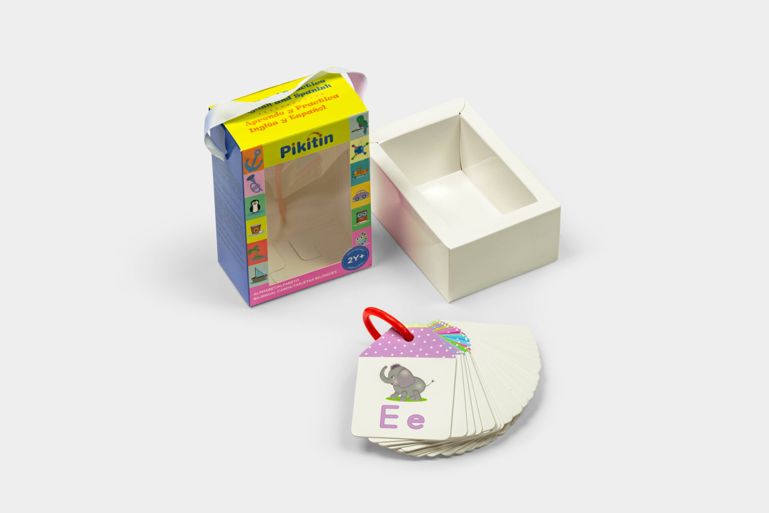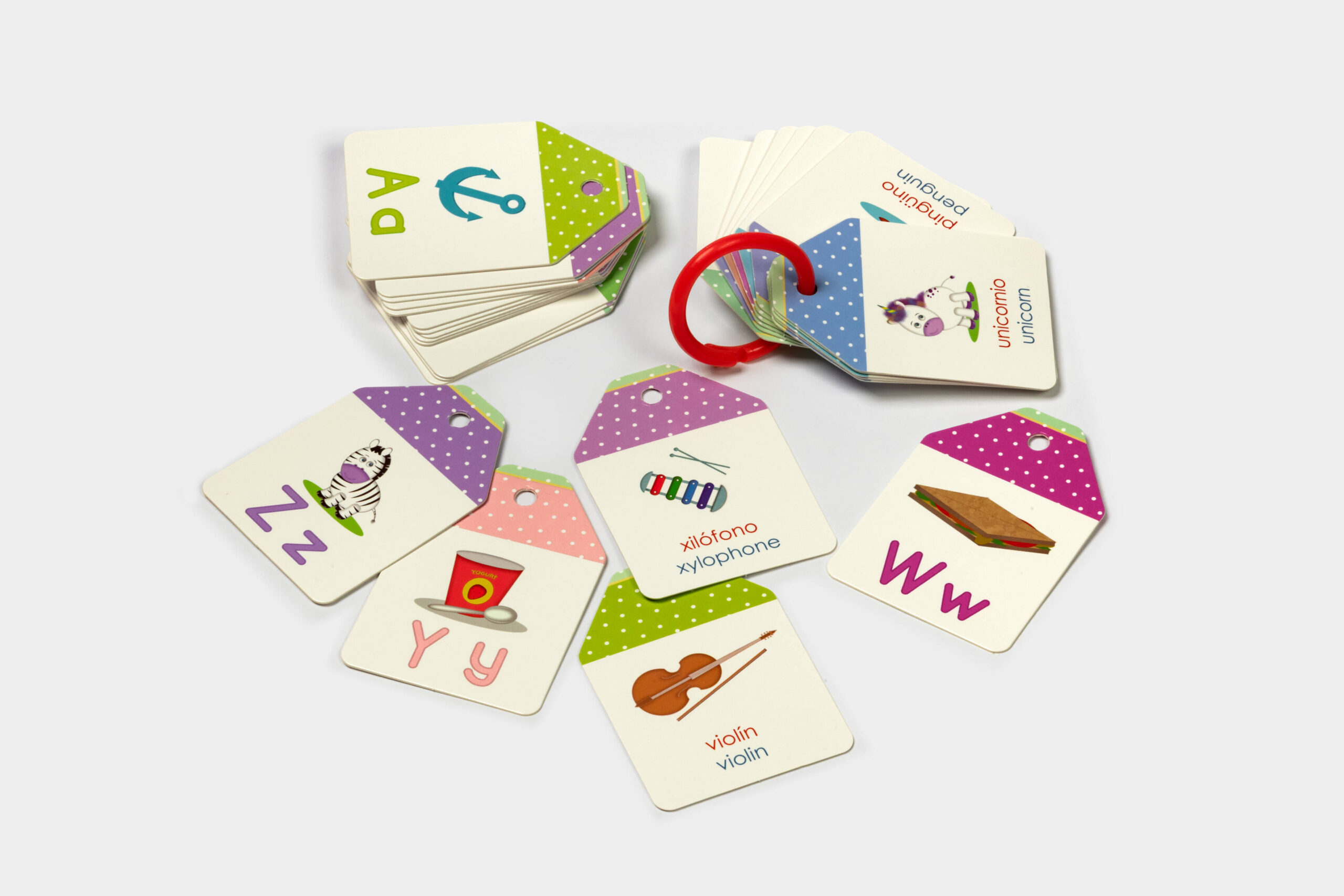 Durable bilingual ABC flashcards featuring essential vocabulary in English and Spanish, connected by a removable ring for flexible learning and play.